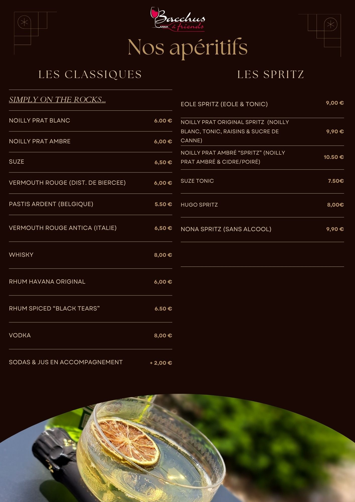 * Une carte d'apéritifs classiques, de cocktails et de spritz,...